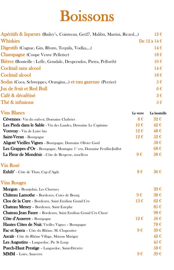 - Whiskies, apéritifs, liqueurs et digestifs : 12€ à 14€