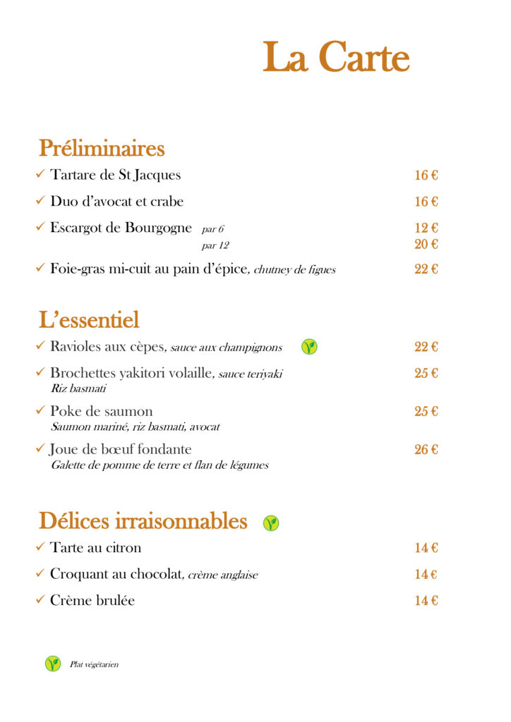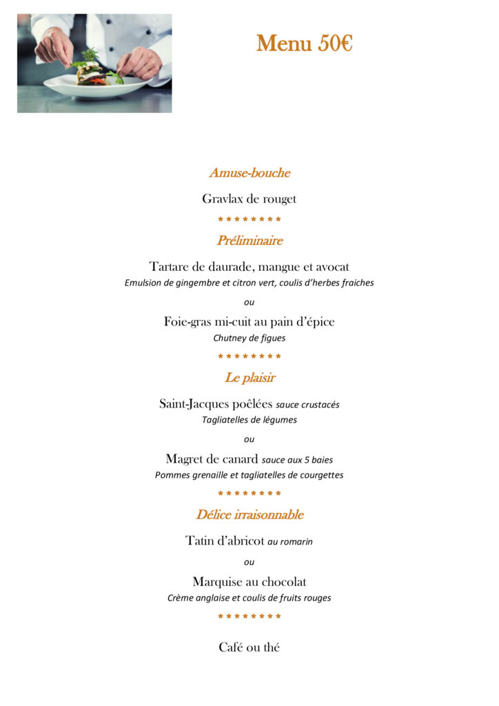 Menu complet entrée-plat-dessert à 50€ par personne hors boisson